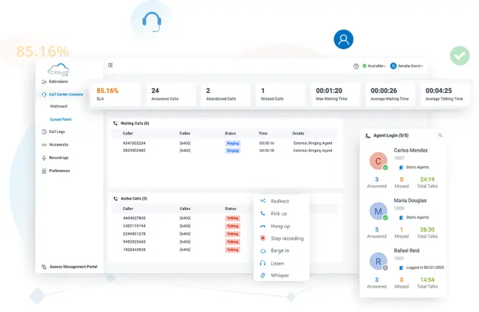 Course-correct agent behaviors easily through whisper coaching, silent monitoring, call barge-in and call recording functionality.